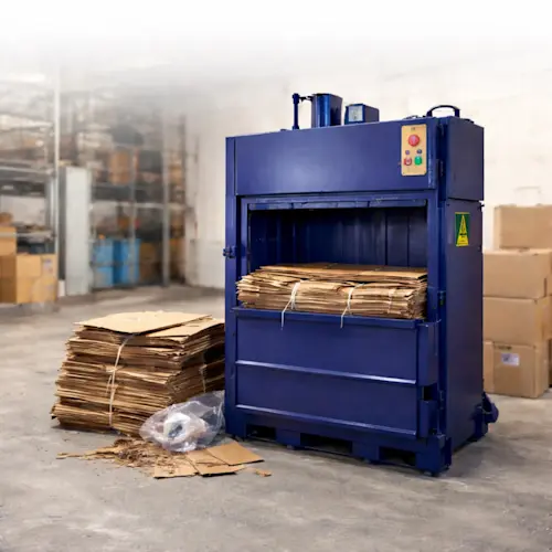 Det är en maskin som används för att komprimera avfall, särskilt kartong och plast, till kompakta balar.